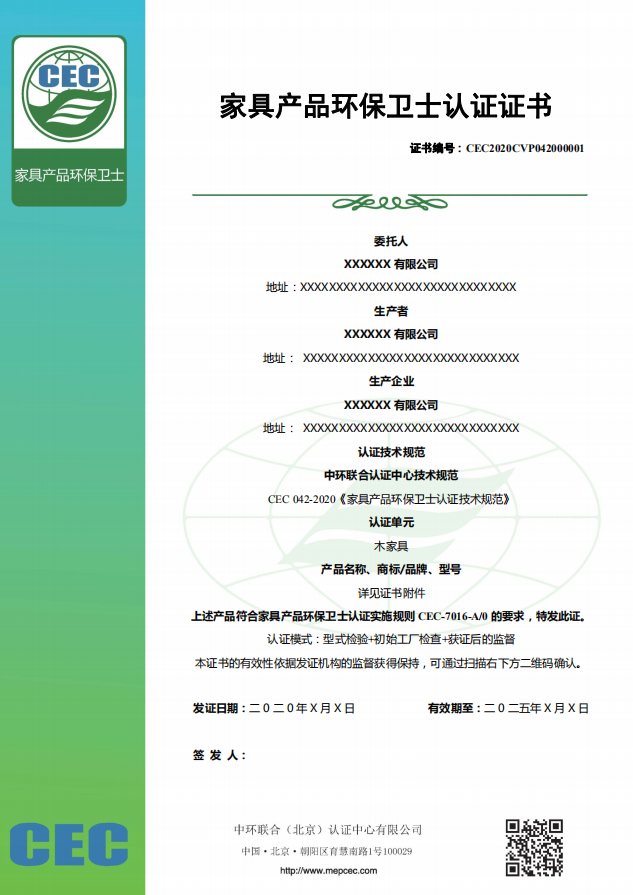 “家具產(chǎn)品環(huán)保衛(wèi)士”認證證書由中環(huán)聯(lián)合(北京)認證中心(以下簡稱CEC)設(shè)計開發(fā)的“其他自愿性工業(yè)產(chǎn)品”認證,認證規(guī)則編號CEC7016-A0,依據(jù)標準編號: CTS CEC042-2020并由中國國家認證認可監(jiān)督管理委員會批準備案,可在全國認證認可信息公共服務(wù)平臺查詢